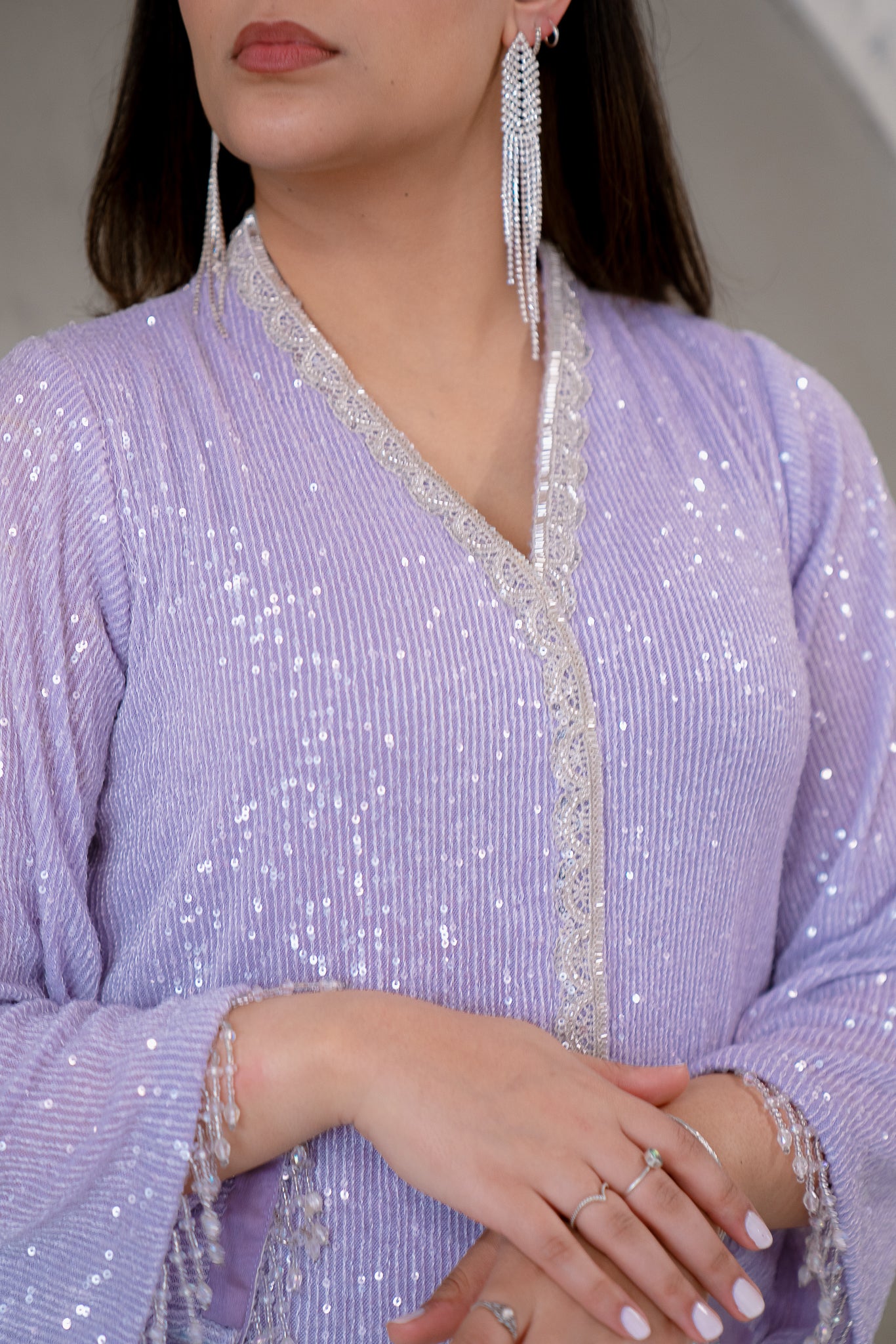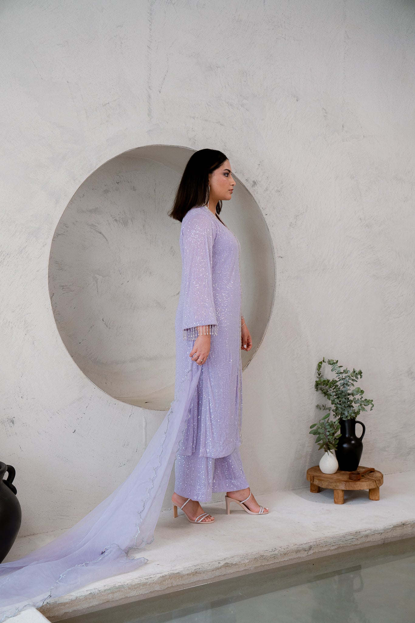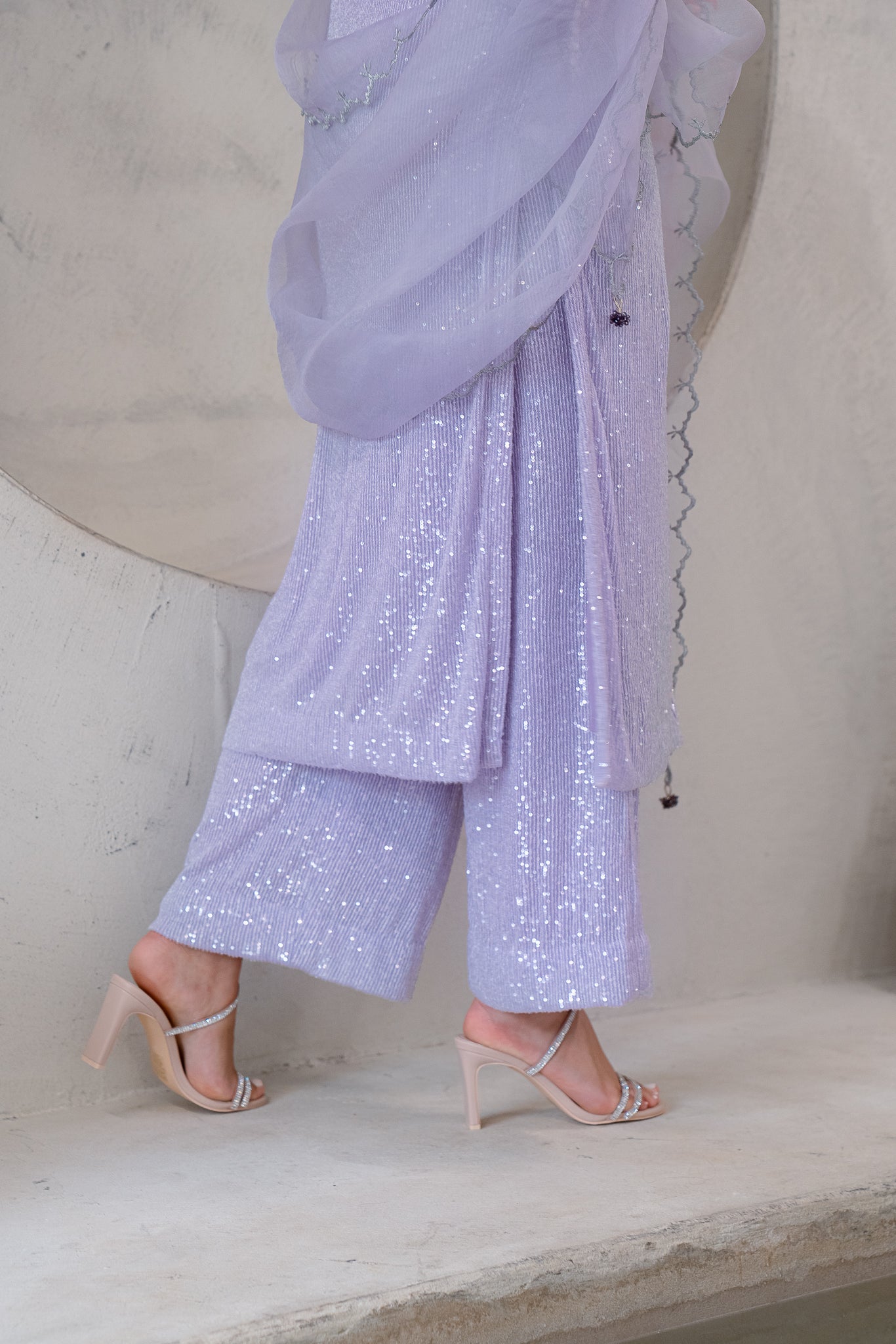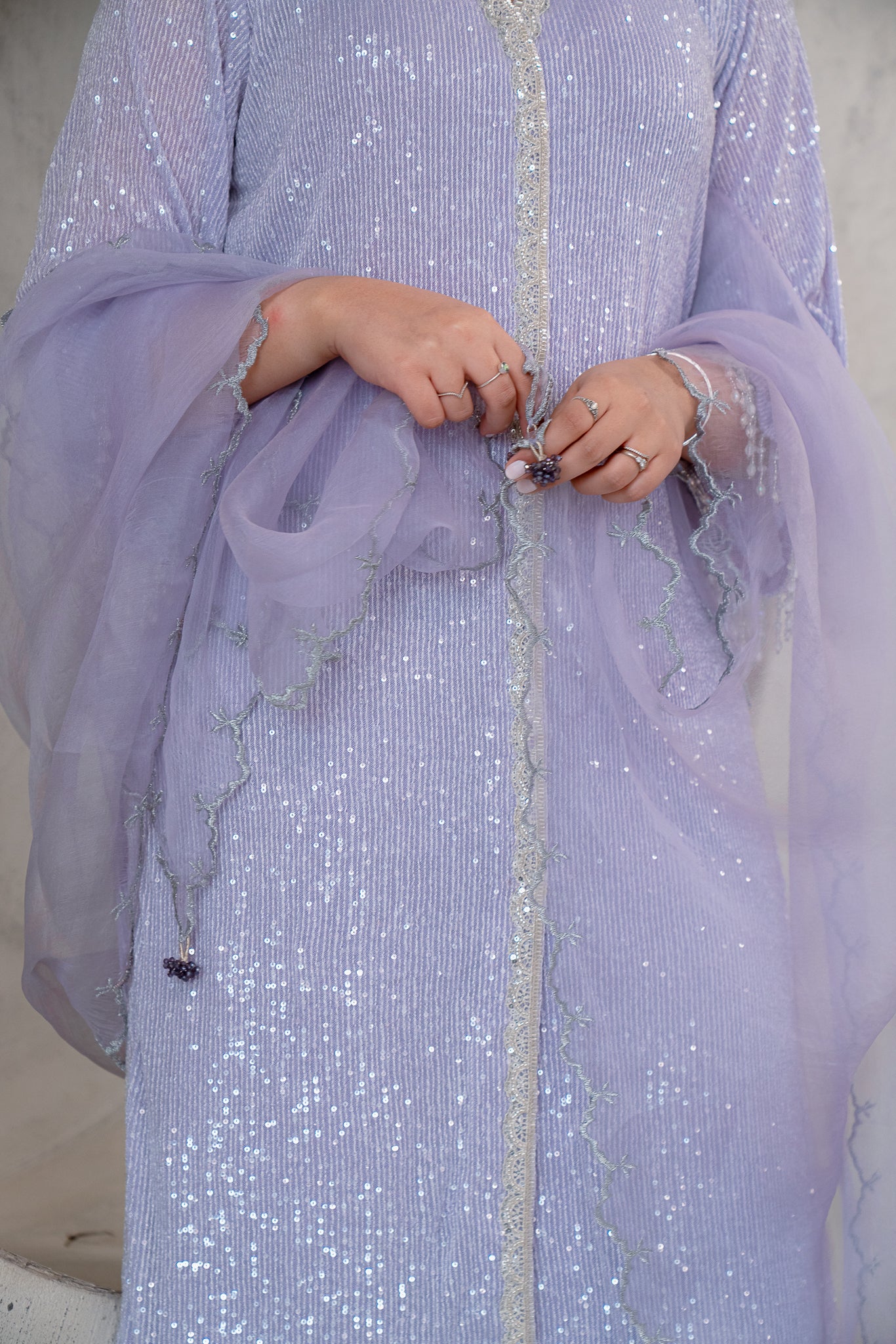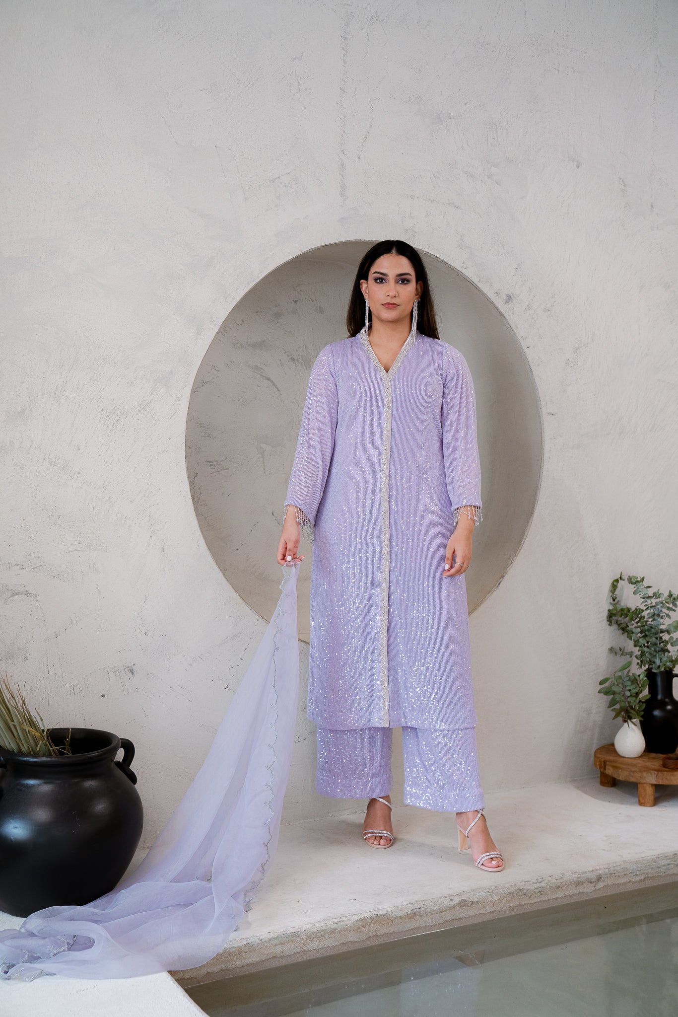 Celebrate this soft sequenced open A-Lined shirt and wide legged straight trousers. The Hamnah article offers crystal embellishments, dangling crystals and slits on the shirt, paired with a pure Organze dupatta with Tilla cutwork, embroidery and handmade beaded droopings.