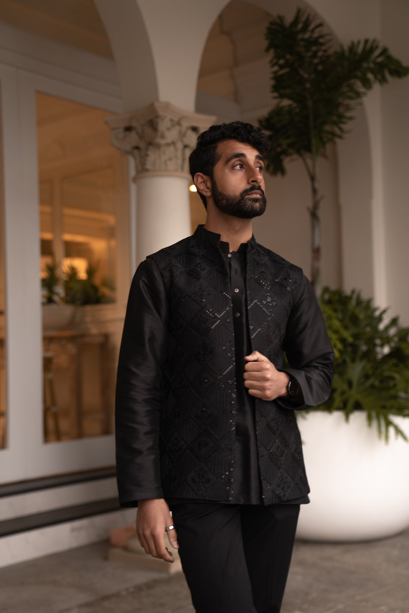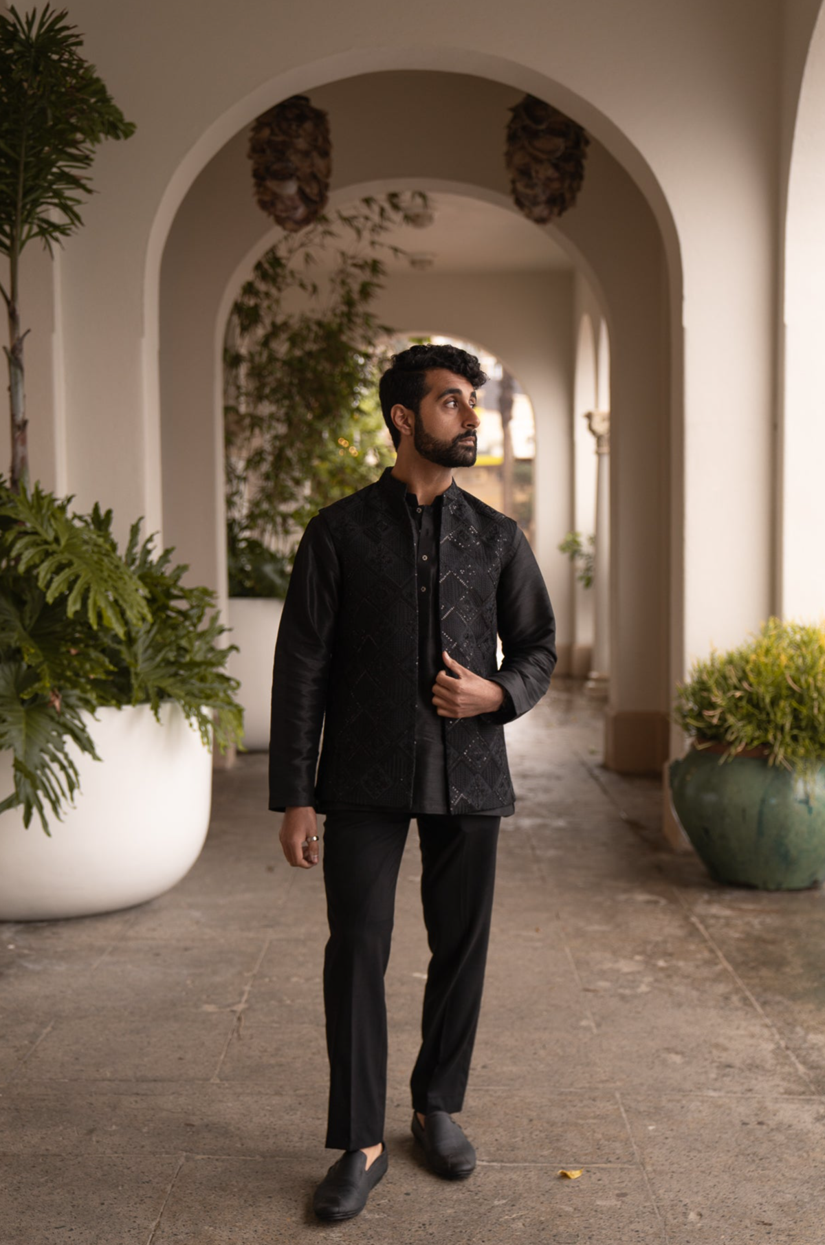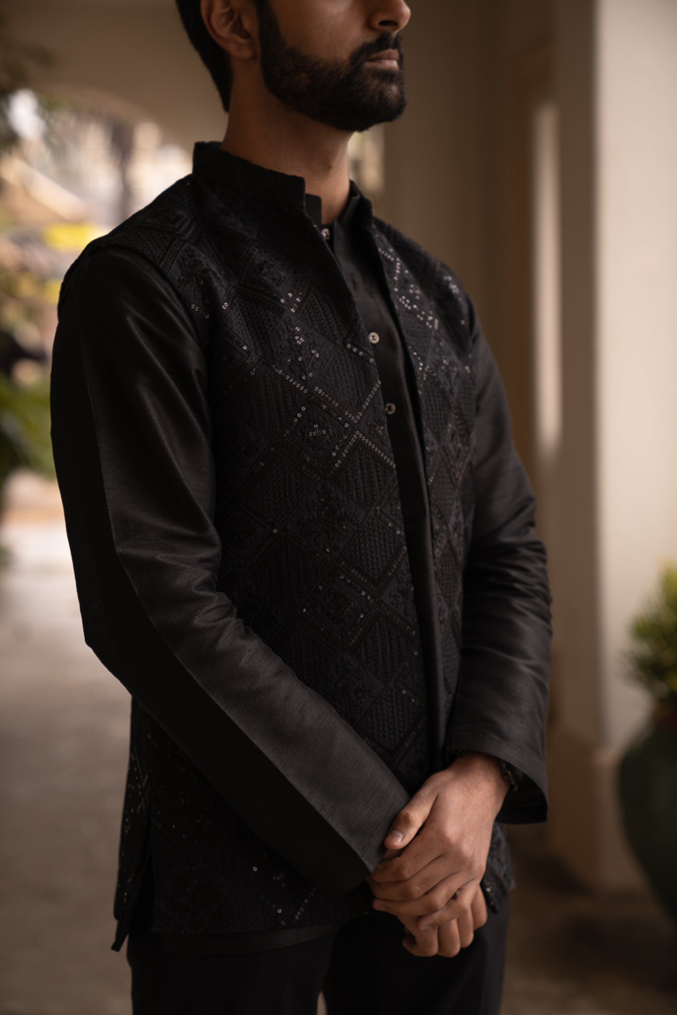 This elegant two-piece set is adorned in semi-sequenced patterns and embellishments Paired nicely with a raw-silk short kurta combined to give you the effortless classy look.